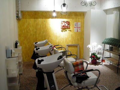 シャンプールームの奥に飾ってあるお花の額はワズからのお祝い。