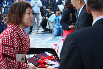 何と、弊社スタッフのムックが、お偉い方々に黄金に輝くハサミを渡す役に大抜擢!(キモノを着てその辺をうろうろしてたから選ばれた)