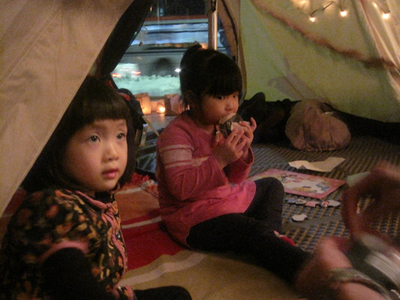 さすが「女の子のハッピーアウトドア」がコンセプトの japonicm らしく、テントで作ったクリスマスツリー。