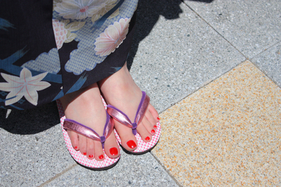 サンダルと言うだけあって、草履とサンダルの中間くらいの雰囲気です。これからの季節は素足でユカタに合わせても最高です。で、草履ですので足袋を履いてカジュアルな小紋などにもかわいい。で、洋服でも全然OKですね。