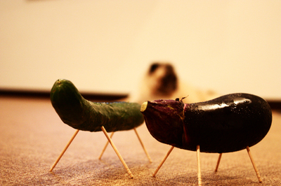 茄子の牛と胡瓜の馬。奥にぼやーっと見えるのは愛犬小梅 笑