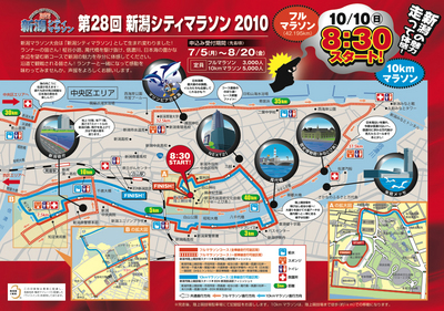 陸上競技場をスタートして、市役所前を通り西堀通りを走ります。で、三越の角で曲がり柾谷小路を直進。古町十字路や萬代橋も走るのです。で、万代に入りBPのあたりから信濃川沿いのやすらぎ堤をひたすら走る。走る、どこまでも走る。県庁も超えて・・走る。そして本川大橋を渡って信濃川左岸に行き、また川沿いを走りBSNがゴーーール!!