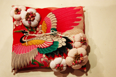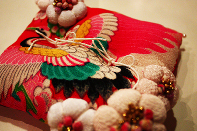 いつもお世話になっている、ブライダルヘアメイクの プロポーズさん が「こんなの作ってみたんですけどどうですかね?」と和柄のリングピローを持ってきてくれました。