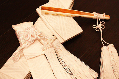 この小物は「箱迫」「懐剣」「末広」「かかえ帯」といいまして、花嫁様の衣装に付ける小物です。今日は打掛けで中は白い掛け下ですので小物も全部白ですが、花嫁振袖のときは赤とか金とか緑とかいろいろあるのです。