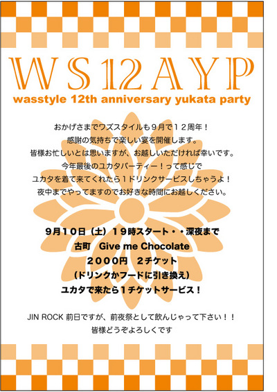 うちのパーティーに来てもらいたい人に JIN ROCK の関係者が多かったので、この日にパーティーをやるのを迷ったのですが・・・もうこれ以上遅くするとユカタって気分じゃなくなるのでこの日に決めました。