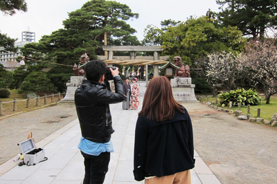 しかしヘアメイクをしてる間に雲行きが怪しくなってきたのですが・・・やるー!!外で撮るんだー!!というお二人の気迫でなんとかロケ撮影できました!!良かったー!!