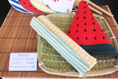 さて、可愛いスイカとトウモロコシの手拭いをちょちょいと折り畳んで100均で買ってきたかごに入れて・・・