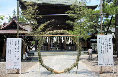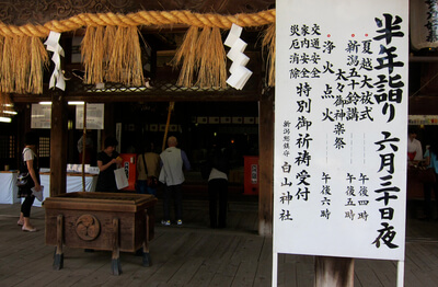 茅輪くぐり 夏越の大祓(6月30日)に行われる行事です。1月から6月までの半年間の罪穢れを祓い清めて、その先の半年間を無事に清らかにご生活ができますようにと祈る神事です。