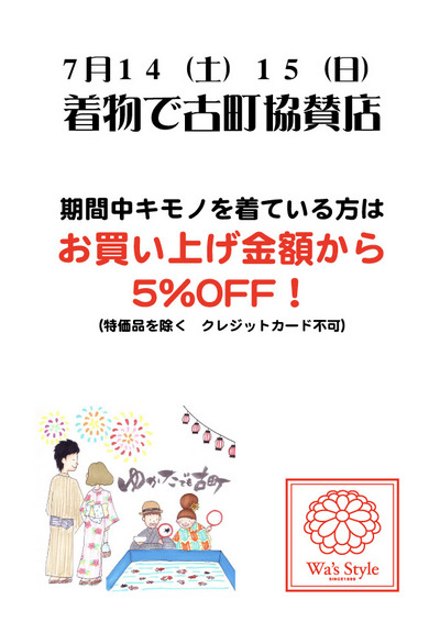 で、今日明日はゆかたを着てワズでお買い物をすると5%OFFですので、新作ゆかたをこのチャンスにゲットして下さい!!(5%ですみません・・祭り前のこの時期はまだ大幅な割引はできないのです・・)