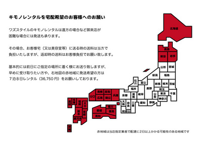 基本的にはワズのキモノレンタルはお店に受け取りにきていただいて、お店に返却に来ていただくと言うシステムになっておりますが、遠方であったり都合が悪い場合などは発送も致します。