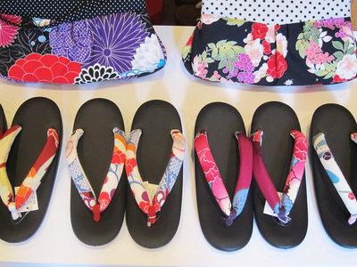 成人式用などに小物を見に来る方が増えています。草履を探している方も多いです。一般的に振り袖用と言いますと、エナメルとかのコーティングで踵が高めで、お揃いのバッグがあって・・って感じのが多いですが(もちろんそのようなセットもワズにもありますよ)ワズ的にはこんな可愛い草履を振り袖に履いてもいいと思いますよ。
