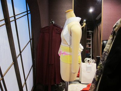 さて、開店直後から「今日は予約も無いし、ディスプレイのチェンジでもしますかねー」って感じで、ショーウインドウと外に飾ってるボディのキモノを脱がして・・・ってやってたら、レンタル相談のお客様が来て下さいまして、一時中断です、裸のボディが裏に追いやられています。