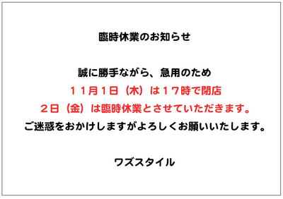 その為、誠に勝手ながら本日は17時で閉店、明日2日金曜日は臨時休業とさせていただきます。