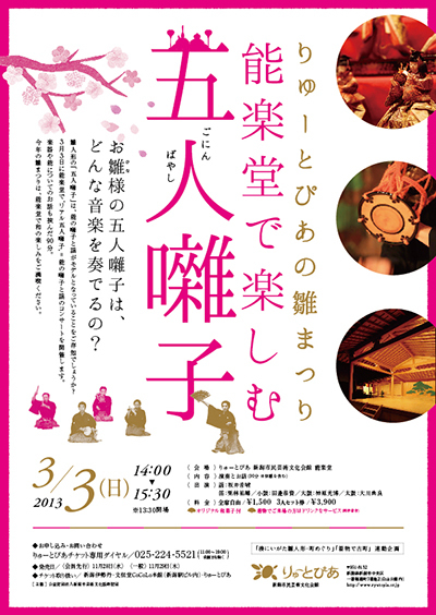 さて、ちょっと先の話ですが、来年の3月3日にりゅーとぴあ能楽堂で「五人囃子」という能の囃子と謡のコンサートが開催されます。