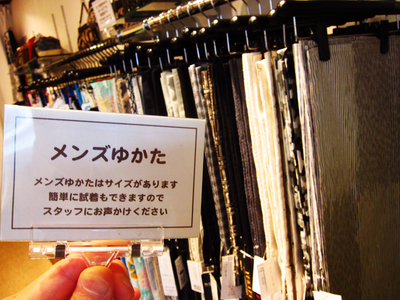 ポップにも書きましたが、メンズゆかたは身長によってサイズがあります。レディスはおはしょり(腰の部分でのたくし上げ)を作って着るのである程度の調整ができるのですが、メンズはそのまま着るのでサイズが分かれているのです。