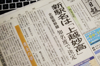 今朝の朝刊一面 新駅名は「上越妙高」って見出し