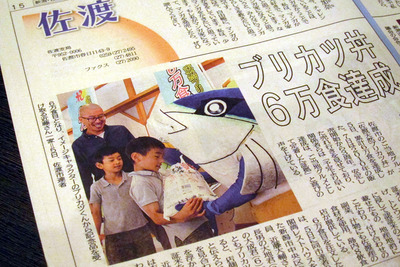 6万食目となり、イメージキャラクターのブリカツくんから記念品を受け取る近藤さん一家
