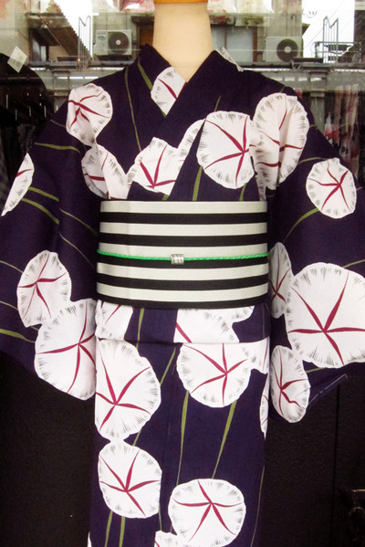 ちょっとレトロな感じもする紫地に朝顔のゆかた。
