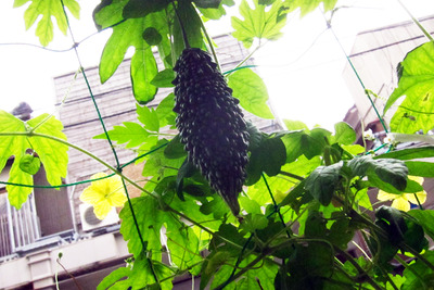 お隣さんのグリーンカーテンにゴーヤが一個、かわいい。