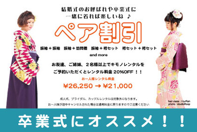 そして、おかげ様で大人気のキモノレンタルペア割引はもちろん卒業式でもご利用いただけます。