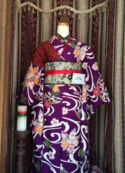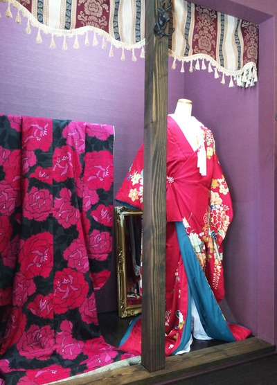 外のショーウインドウ、店内でもカーテンとして使っている布で覆ってみました、豪華だ!!こんなキモノ屋は他に無いだろうなー 笑