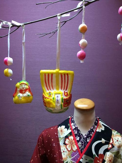 昨日お店をお正月らしくディスプレイしましたが、この「まゆ玉」という飾りはどうやら1月15日に飾るらしい・・・