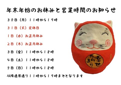 ワズスタイルは30日まで、新年は3日からの営業となります、よろしくお願い致します。