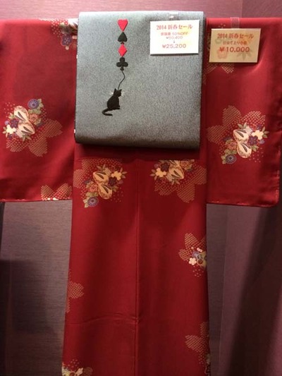この赤い仕立て上りの小紋は1万円です!!わお!!そしてかかっている可愛い猫柄の京袋帯は50400円が半額の25200円となっております。