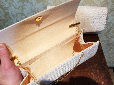 これはかなりいろいろなシーンで使えると思います、結婚式のお呼ばれにもバッチリです、幅が28センチくらいあるので長財布やご祝儀袋なども余裕で入ります(意外と入らないバッグって多いのです)チェーンもついてますよ。