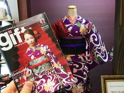 振袖着せ変えました、先日発行された上越市のフリーペーパーGIFTで表紙に使ってもらった紫の振袖です、これはかっこいい!