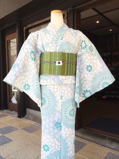 たまにはこんな感じの上品なユカタもご紹介しましょう、淡い色のユカタはちょっと濃いめの帯でピリッとアクセントを聞かせるのがオススメです。(と言ってもあまりキツいコントラストになるとせっかくの大人っぽさが失われるのでこのくらいの組み合わせにしてみました)