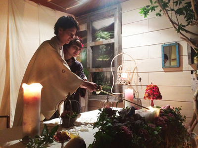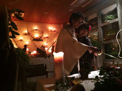 新郎新婦が高砂席でメインキャンドルに点火した瞬間に、後ろで隠れてるスタッフが布を引いて背面の壁のキャンドルが現れるというある意味原始的なやり方 笑