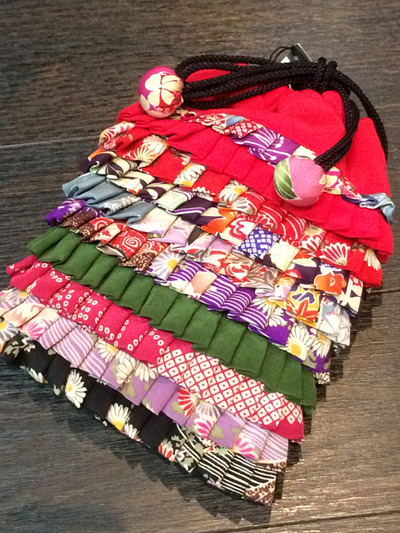 さて、以前に仕入れたらあっという間に売れてしまった、このこだわりすぎな巾着袋・・・何枚パッチワークで使ってるのか・・・再入荷です。