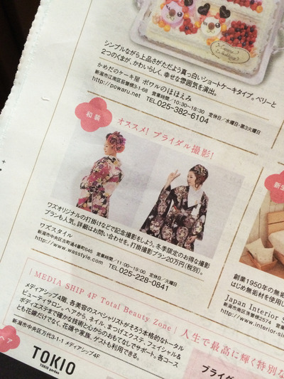 と言う事で、週末です、昨日新潟日報の折込で入った ASSH に wedding assh ってのが挟み込まれていまして、そこにワズが載ってます、オススメ!ブライダル撮影!って事で載せてもらいました。