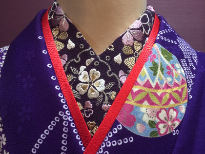 で、この写真で注目してほしいのが衿もとなのです、紫乃刺繍の部分、キモノの下に着る長襦袢に縫い付ける衿で「半衿」と言いますが、ここ重要!!