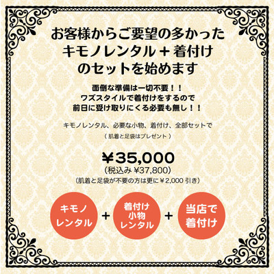 セット料金は、キモノレンタルと着付け用小物レンタルとワズ店内での着付けが入って35,000円(税込み37,800円)となります。