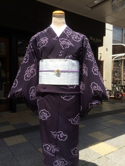ユカタなのですが長襦袢も着せましたのでこれは完全に夏キモノとしてお使いいただけますね・・というか、ユカタに見えませんね。一重のキモノとしてオススメです(衿の仕立て方は若干違いますが着てしまえば全くわかりません)