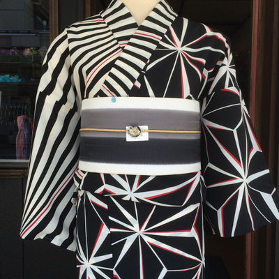このような幾何学模様っぽいのはもともと珍しいですが、こんな組み合わせにすることでもっと珍しい!!1ランク上のゆかたスタイルをご希望の方には自信を持ってオススメします!!