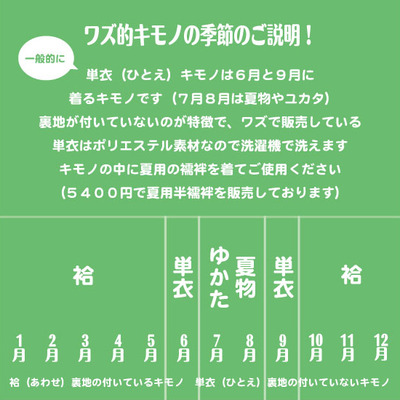 わかりやすい図を作ってみました、一年間でどの季節にどんなキモノを着るのがいいのかって事です、コレが一般的に言われている季節ごとのキモノの決まりです。
