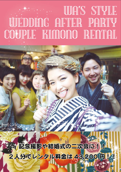 はい、カジュアルな結婚パーティーには、このカップルプランがオススメなのです、意外性です、パーティーで新郎新婦がキモノだったらちょっとびっくりすると思うんです。