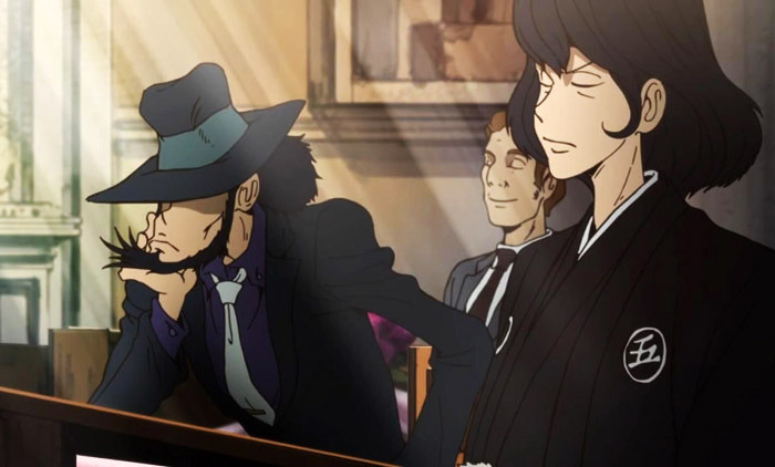 冒頭からルパンの結婚式シーンって事で、もちろん次元や五ェ門、不二子ちゃんも出席していましたが、ボク的に気になったのが、五ェ門の紋付姿。もちろんフォーマルな場ですので黒紋付に袴でいいのですが、石川家の紋なのに◯に五!!これは家系の紋ではなくて五ェ門個人の紋だな 笑