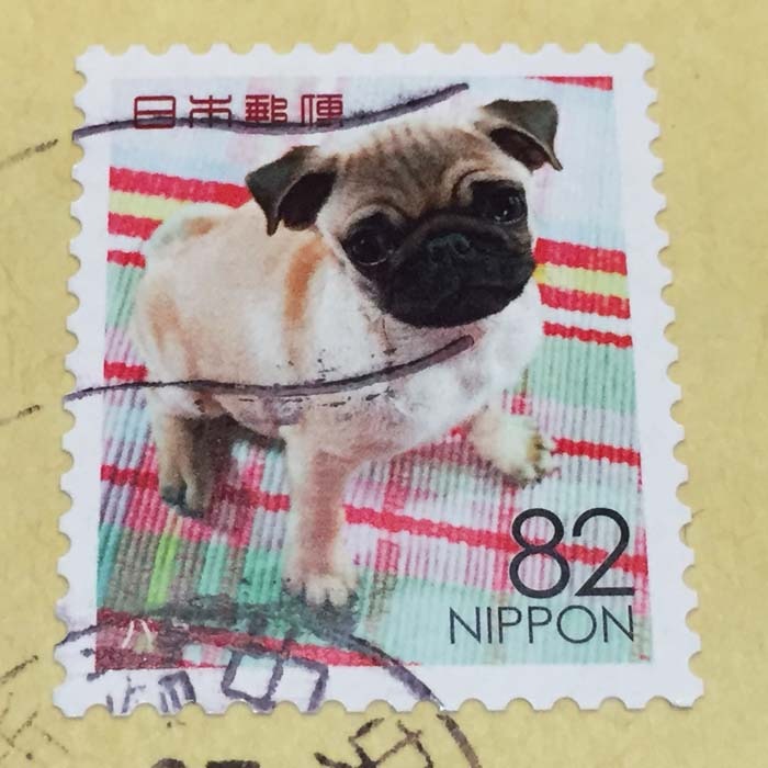 切手を貼っている時にワズスタイル宛の封筒を見て「あ、ワズのヨウイチはパグが好きだよな、そういえばパグの切手あったかも、あれで送れば喜ぶかも」と思ってくれたわけですね、はい喜びました、彼が思ってくれた以上に喜びました、妻も娘も喜びました。ボクはこの事をフェイスブックにもブログにも書きます。彼がしてくれた行動は、別にどの切手を貼っても金額は一緒ですし、普通の切手で送られて来てもボクは嫌な気持ちなんて感じるわけないですし、してもしなくても何の問題も無かった事です。