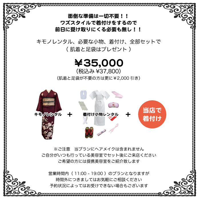 このプランですと、着付け用の小物も草履も全部セットになっています(肌着と足袋は使用後差し上げます)そしてワズ店内での着付けも付いていますので、手ぶらでワズに来ていただければそこで着付けしてGOです。(ヘアメイクは当店ではできないため別にしてあります、ご希望の方には美容室を紹介致しますのでお気軽にお申し付けください)