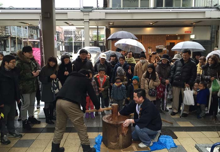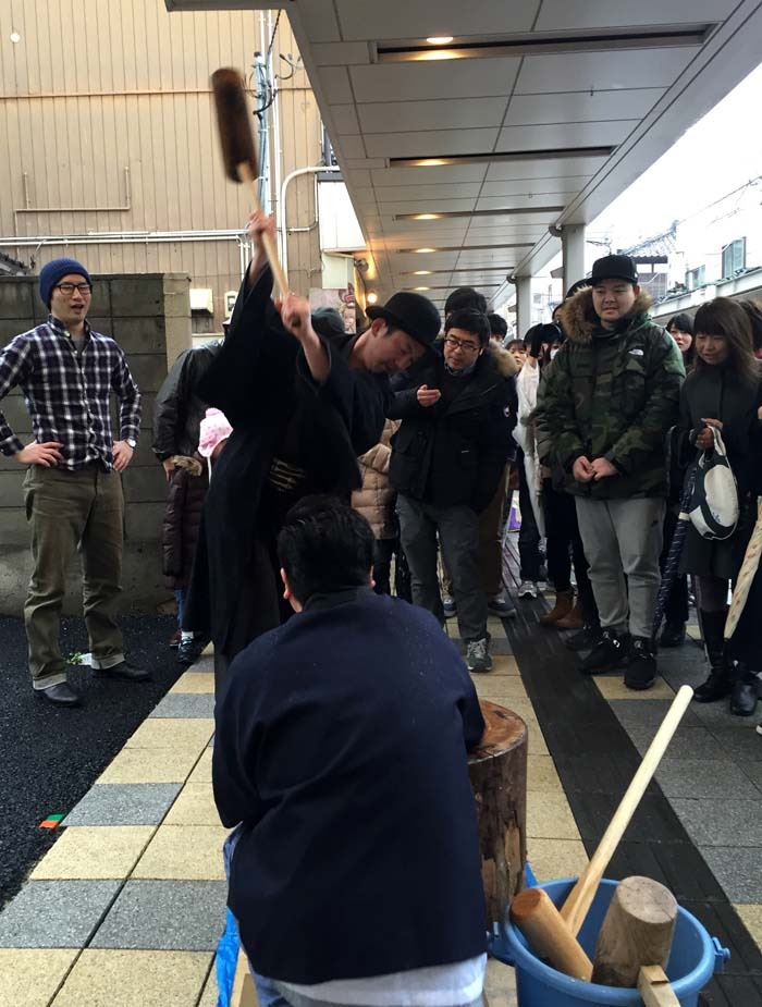 餅つきで重要なのは最初の目潰しという地味な作業なのですが(これが一番の重労働)もはやボク達は毎年の作業で慣れていますので(笑)最初は商店街メンバーである程度の「餅状態」になるまでつきまして、そこからは見に来ていただいている皆さんにもついていただくのです。