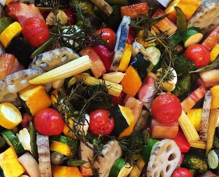 野菜切ってぎゅうぎゅうに隙間無く詰め込んで塩こしょうとオリーブオイルかけて150度のオーブンで40分くらい焼くだけー、簡単で美味しいー、皆さんお試しあれー。