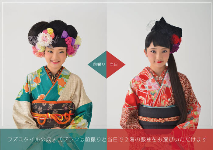 こんな感じです、振袖も髪型も変えて2パターン楽しみましょ!