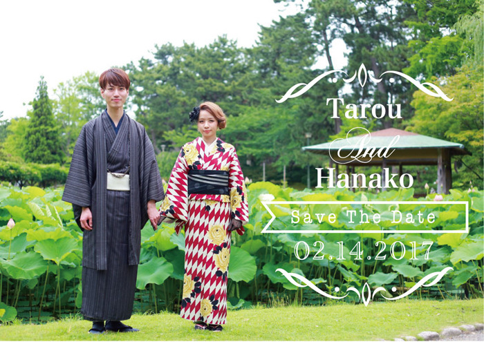 見本を作ろう・・何かロケ撮影したカップルのいい写真ないかなー・・とフォルダを探したら数年前にフクフクで白山神社付近で撮影したのがあったので、それにSAVE THE DATEっぽいロゴをつくって乗せてみました、来年のヴァレンタインデーに結婚式決まったよ!!って時はこんなSAVE THE DATE(さすがに1年先は少ないと思うけど)