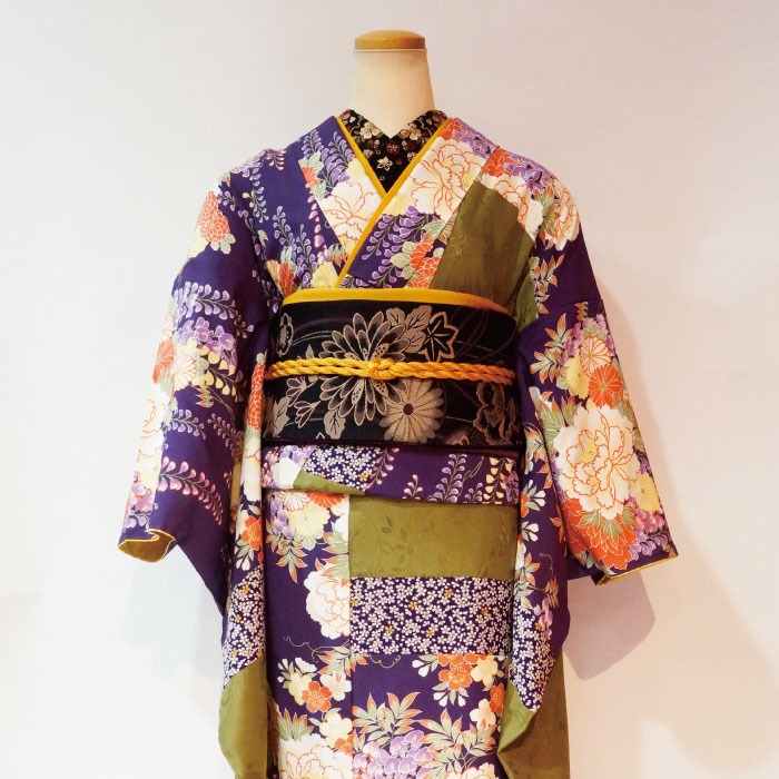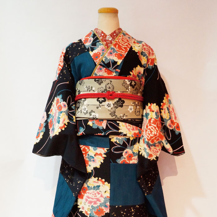 はい、先日もちょこっと載せましたが、ワズお得意のパッチワーク振袖ができまして、店内で簡易撮影、早くモデルちゃんに着せて撮りたい。