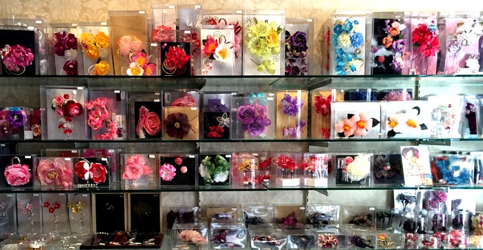 ここ一年でかなり髪飾りを増やしました、キモノを着るときのヘアメイクと飾りは重要だと思っているからワズとしては沢山の種類の中から飾りを選んでいただきたい・・でもお店が狭いので置く場所が限られている・・・で、結果的にごちゃごちゃです、棚の後ろに隠れている事もありますので、後ろも見逃さずに探してください 笑