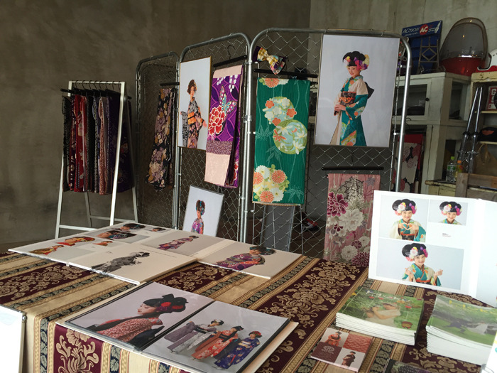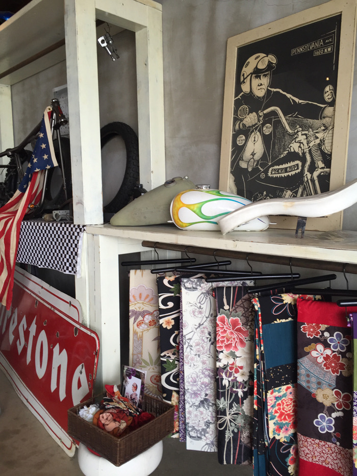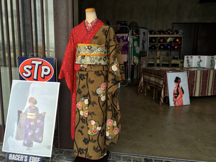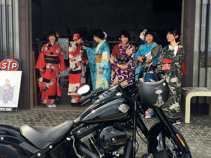 バイクのガレージですから・・もちろん普段はハーレーなどが止まっているのですが今回は・・振袖!!まわりお店のスタッフさん達や常連のお客さん達もびっくりしてました 笑